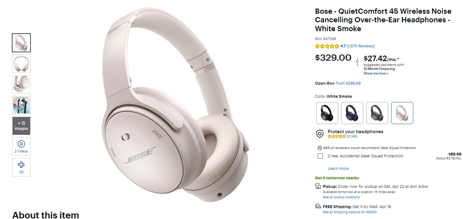 介绍: Bose QC 45白色 仅试用了一次一直放着,购于5/31/2022. Open box condition. 安娜堡 周围地区可送货