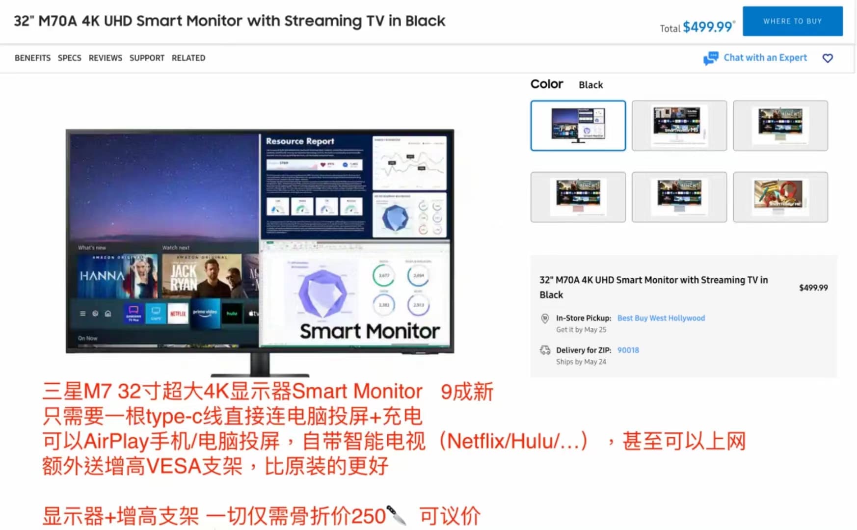 介绍: 三星M7 32寸超大4K显示器Smart Monitor 9成新只需要一根type-c线直接连电脑投屏+充电可以AirPlay手机/电脑投屏,自带智能电视(Netflix/Hulu/…)甚至可以上网额外送增高VESA支架,比原装的更好 显示器+增高支架 一切仅需骨折价250~ 可议价