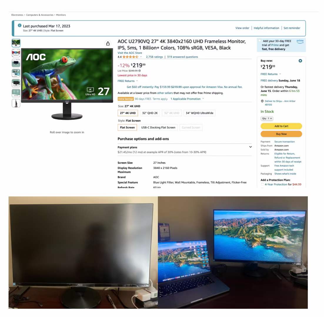 介绍: 【出闲置】出一个显示器: AOC U2790VQ 27寸,4K60Hz,108% sRGB,状态非常新(三月份购入),有一根HDMI的线和一根DP线。120出,Courtyard自取