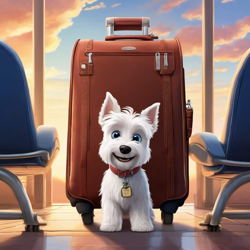 Make a Disney Pixar movie poster with the title Sami’s Adventures. A cute and friendly Westie with a travel bag, boarding the plane.