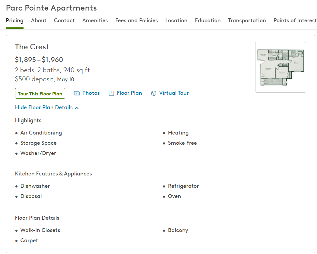 【转租】北校Parc Pointe 2b2b 房型是Crest可租整套 或其中的1b1b(次卧 但也带独立卫浴)
