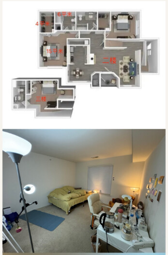 【环境】:三层楼的新房子+3停车位。卧室宽敞明亮采光好,独立卫浴,步入式衣帽间/储物间。公共空间有开放式厨房+客厅+餐厅+inhouse独立洗烘房+露天小阳台+储物间+壁炉。家具齐全,可拎包入住。