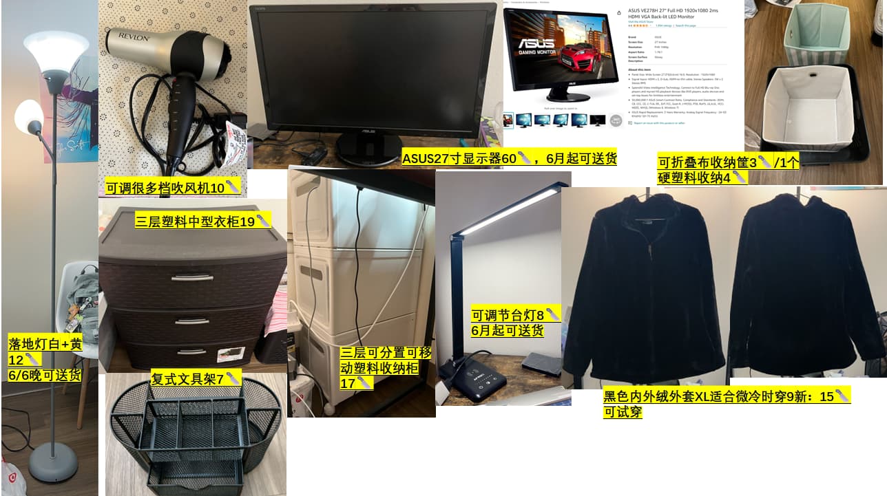 介绍: 出:插座充电线转换头手机膜手机壳 文具水笔修正带文件夹订书钉鼠标垫 各种收纳箱收纳盒 全新二手衣物外套 车载手持吸尘器遮阳棚厚手套部队帽 文件柜 黑胶机和音箱 矮衣柜/吹风机 落地灯台灯显示器 六月可拿,坐标北校willowtree,自取/送货可以详谈