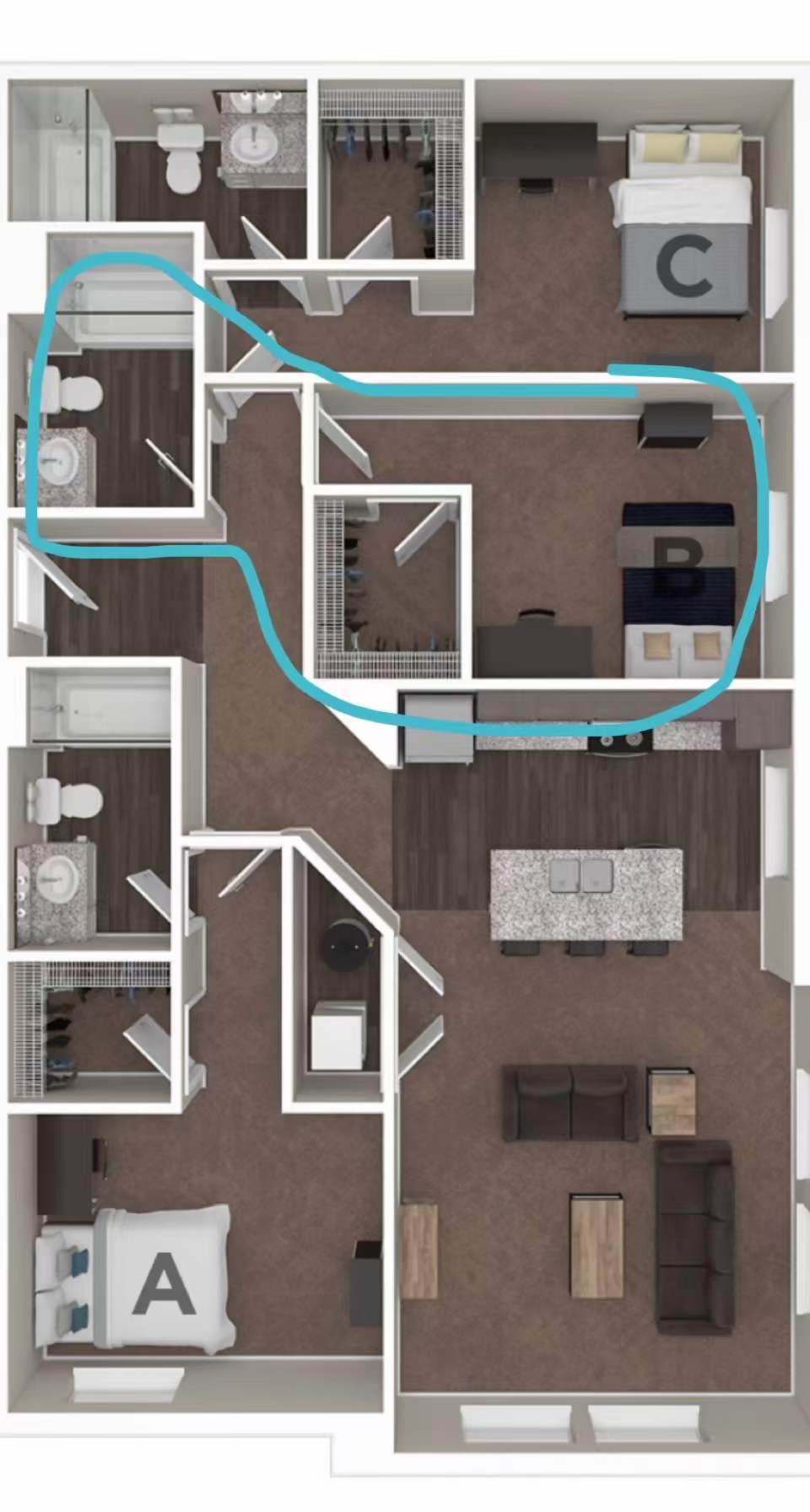 5 月至 7 月,租金 1 , 075 英镑,包括一间卧室和一间浴室。