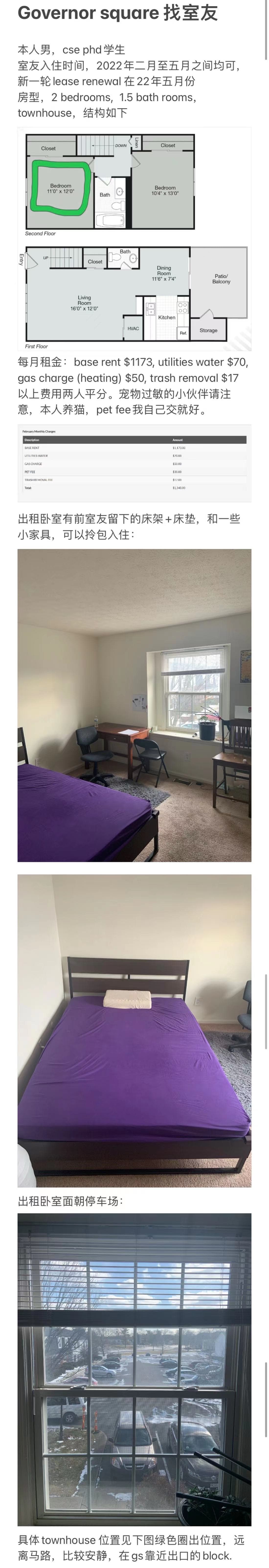 介绍: Governors Square 2b 1.5b 找长租室友,三月到五月期间,可以拎包入住。新合同5月续签,五月以后才能入住的也可以商量。