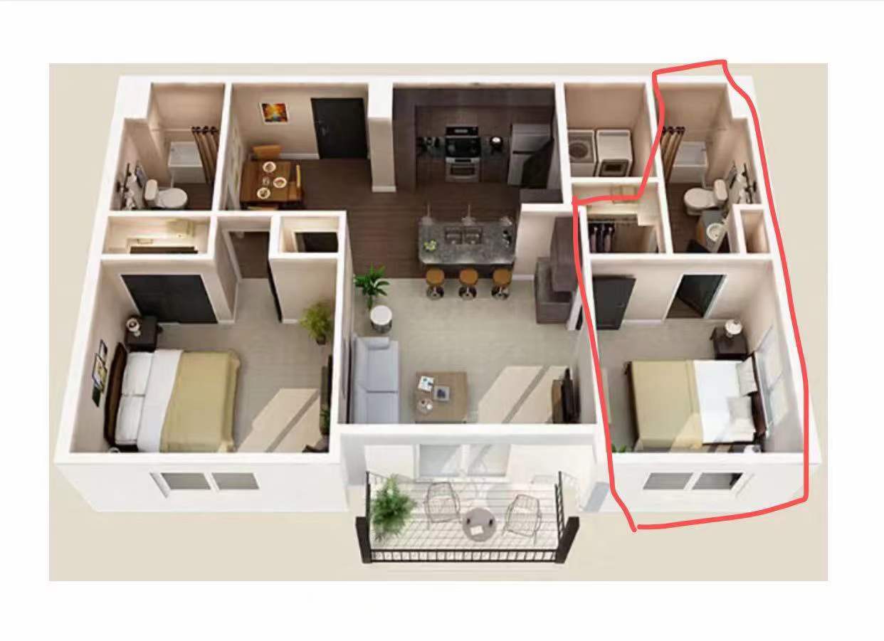 室友是女孩子,客厅带餐桌椅子,可拍照可视频。租期5月到8月,可续租。有独立洗衣间有洗衣机和烘干机。卧室自带床架和床垫,写字台,全身镜,屋内含独立卫生间。一楼大厅有免费咖啡和休息区。二楼有健身房,瑜伽室,娱乐室,泳池和户外休闲区。距离学校车程十分钟不到,附近步行可到Coco Hotpot,久泰等中餐厅及韩超。
