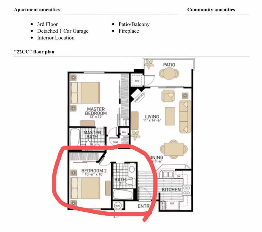 2b2b中的1b1b有车位,拎包入住 大华附近,离学校,DJ等各大超市Plaza都只需要5分钟,门口就是OC Bus交通便利,gated小区和车库,均需钥匙才能进去,十分安全 6月现在到7月初开始到9月初,之后可以跟Leasing Office续租,限女生 包水费 房租1600 欢迎看房