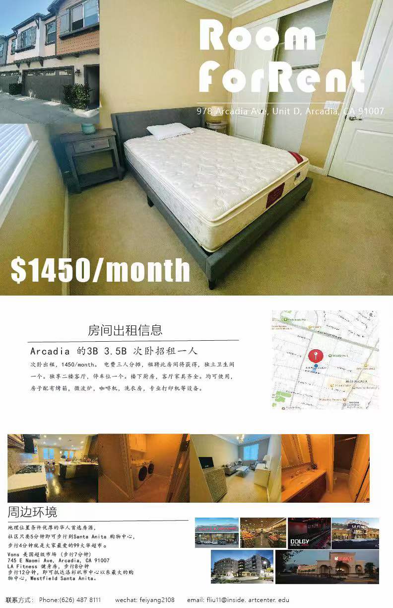 【合租】合租Arcadia 的3B 3.5B Town house。周边超市 Hmart 大华 广场Mall,吃饭方便。次卧招租一人,有车位,包水网。可养宠物。