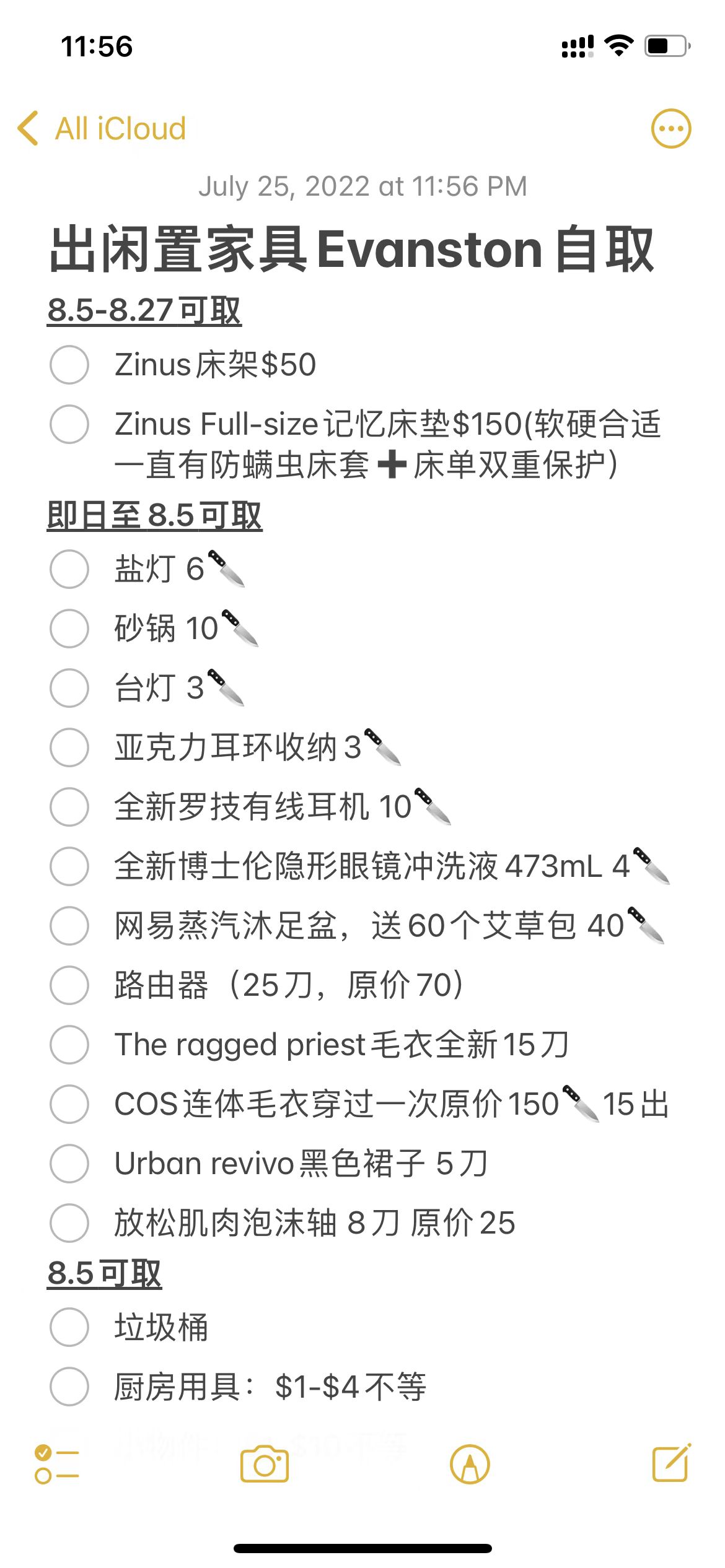 出闲置家具Evanston自取,部分家具即日至8.5号可取(可协商具体时间)床和床架8.5-8.27可取。感兴趣的可戳我^_^