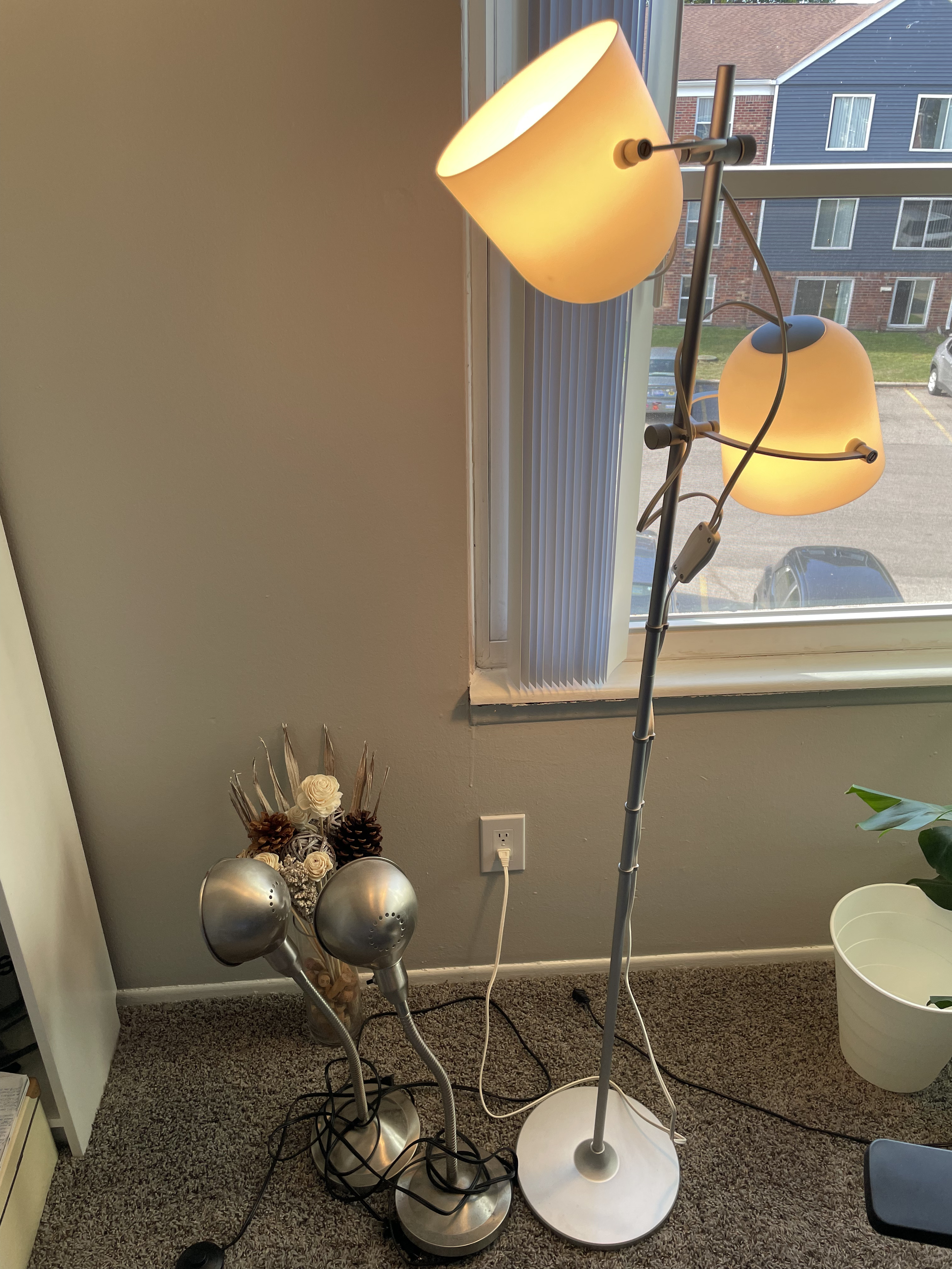 出一个立式台灯8刀(上面那一盏最近有一些接触不良,可能需要换灯泡),两个桌上台灯一个5刀,自取48108,或者可以帮忙带去中校。