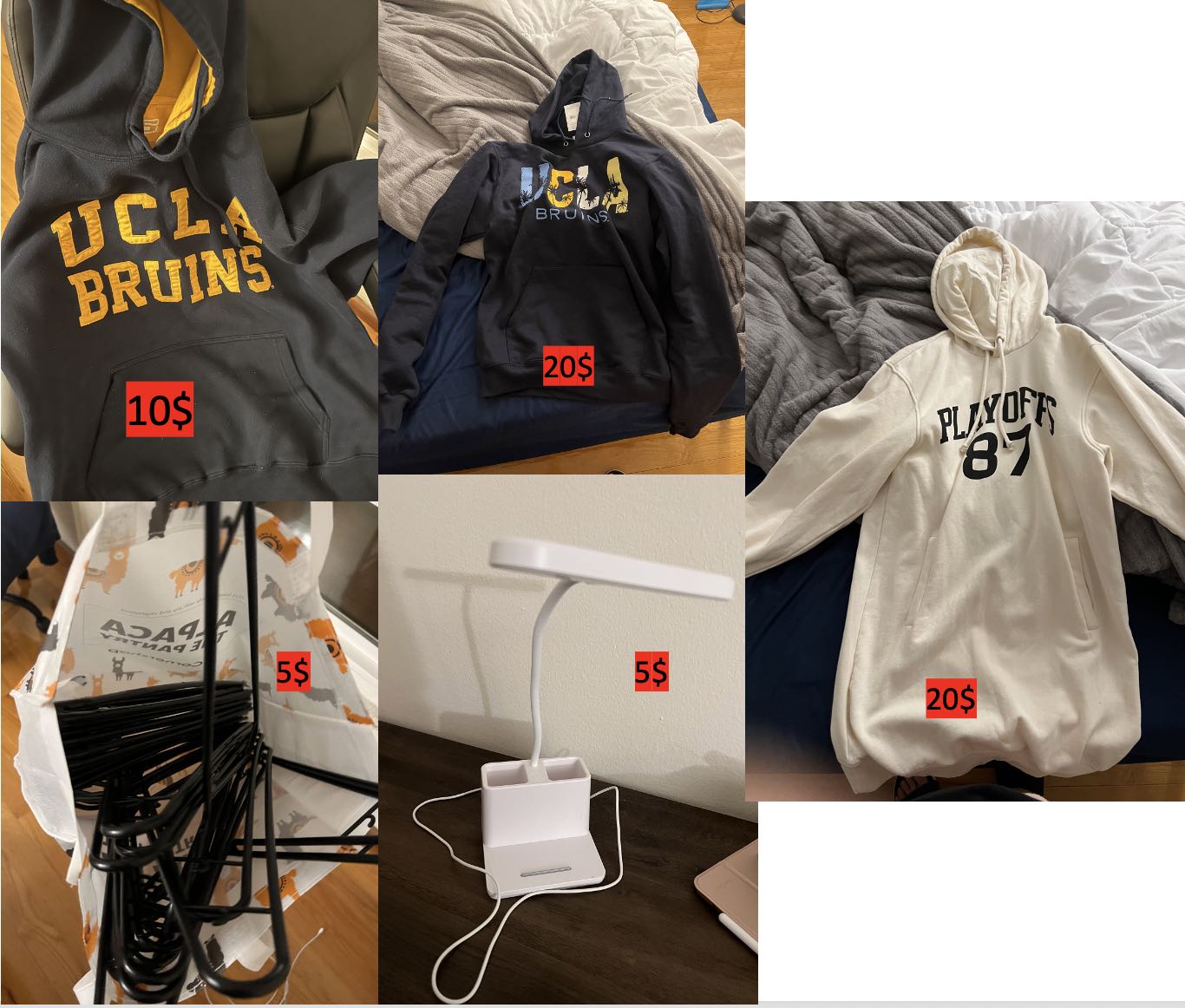 一大包衣架5$,二手UCLA卫衣10$,两个全新卫衣各20$,台灯5$。