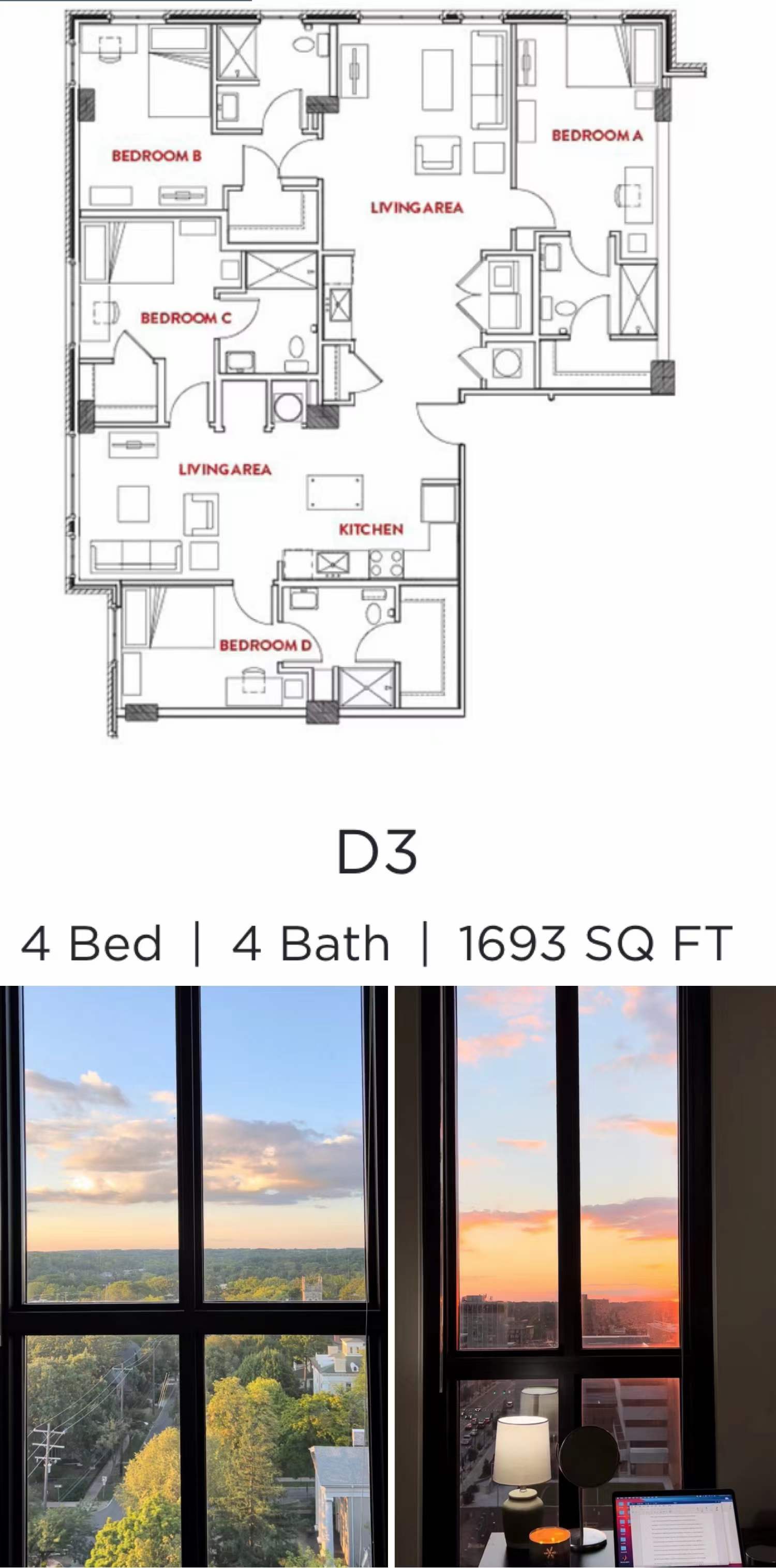 【房型】4b4b中的1b(room B最大),有两个客厅,房间内三个落地窗,阳光很充足