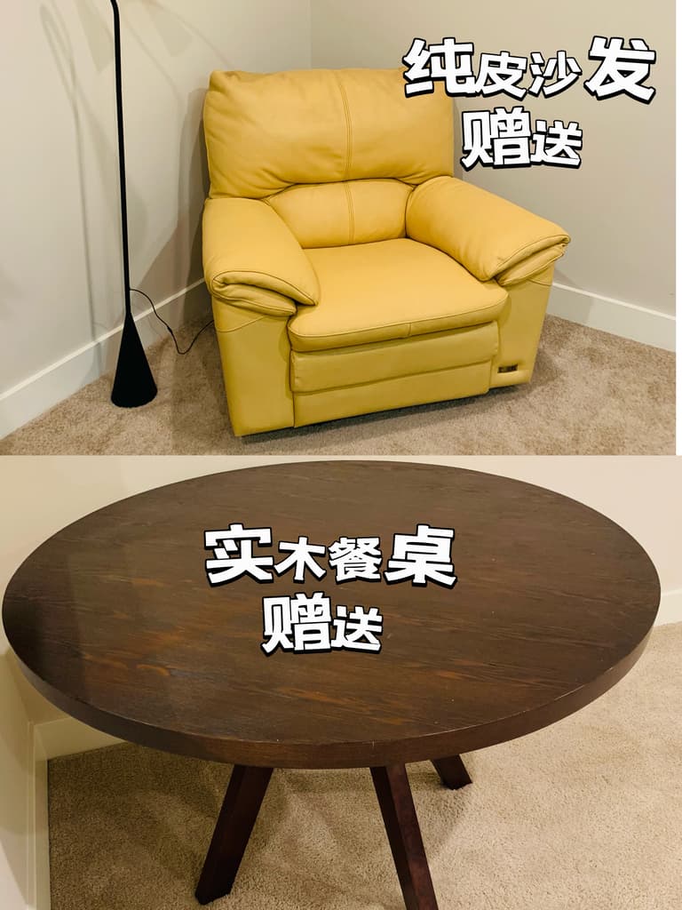 【家具齐全】:客厅大木桌、卧室工作/学习桌、台灯+落地灯、纯皮沙发、Queen大床、专属洗烘。